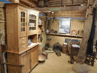 Im Fach „Hausarbeit“ sticht der typische Küchenschrank hervor, die alte Eichenwiege steht neben dem Butterfass, am Kesselhaken hängt der Teepott und der seltene Feuerkorb steht neben der Fußkieke.