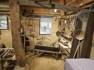 Bei der „Hausschlachtung“ stellt der große aus einem Stamm gehauene Holztrog eine Rarität dar. Diverse Hackmesser, Wurstgabeln und Abschraper hängen am Fleischhaken neben dem Krummholz.