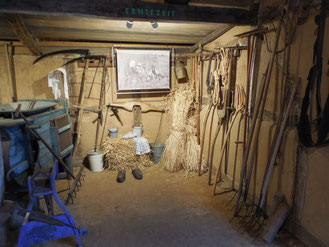 Im Gefach „Getreideernte“ sieht der Besucher Erntegeräte wie Kniesense, Mahdhaken, Dreschflegel, Forken und Sensen sowie eine Staubmühle.