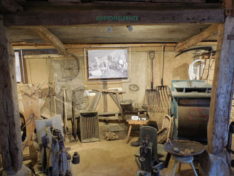 Das Fach „Kartoffelernte“ zeigt neben der Dezimalwaage, Pflanzhilfen, verschiedene Körbe und die typische Kartoffelforke.